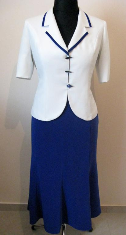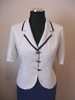 Żakiet uszyty z tkaniny ,,sparking" w kolorze ecru z szafirowymi lamówkami.