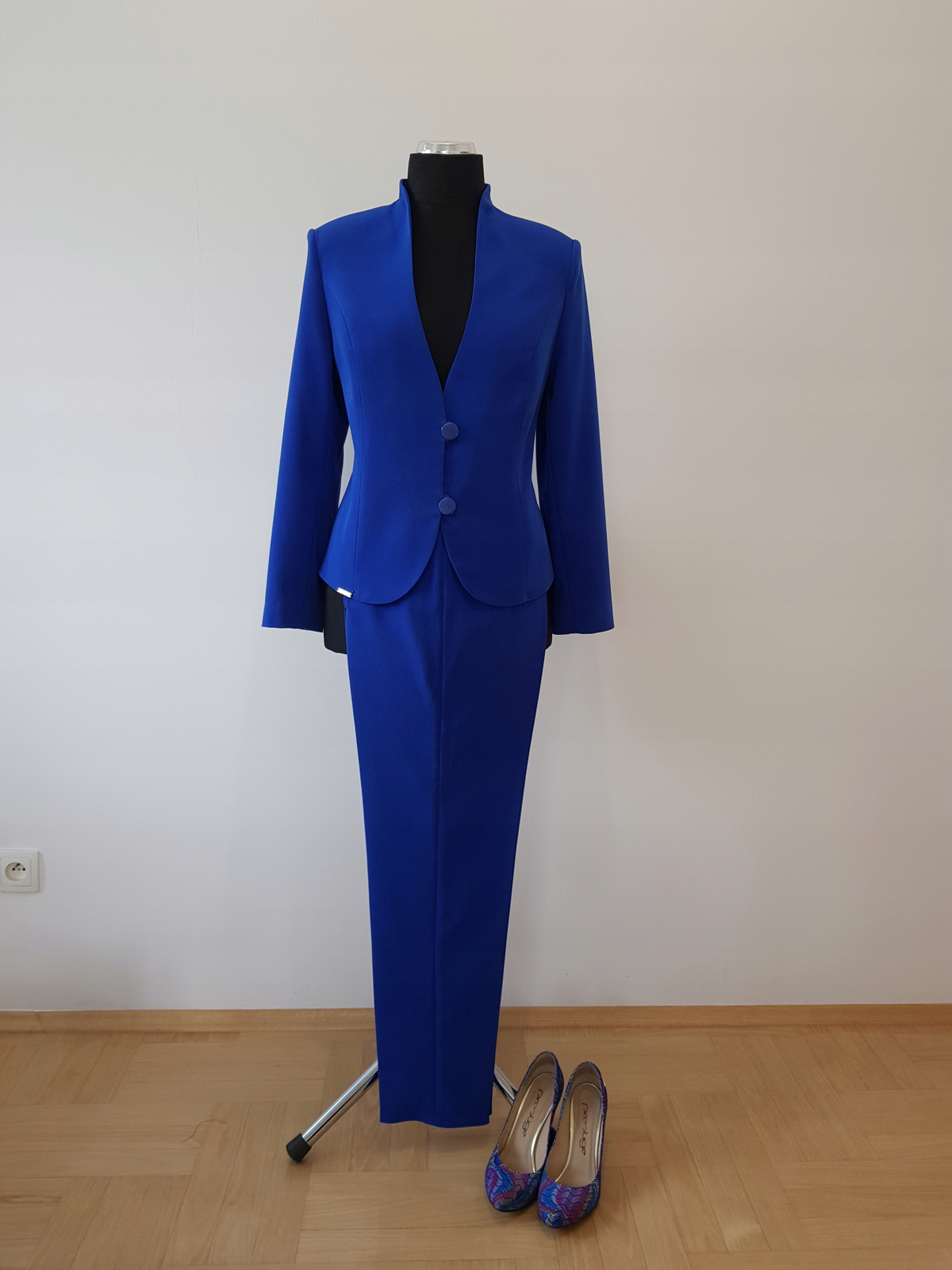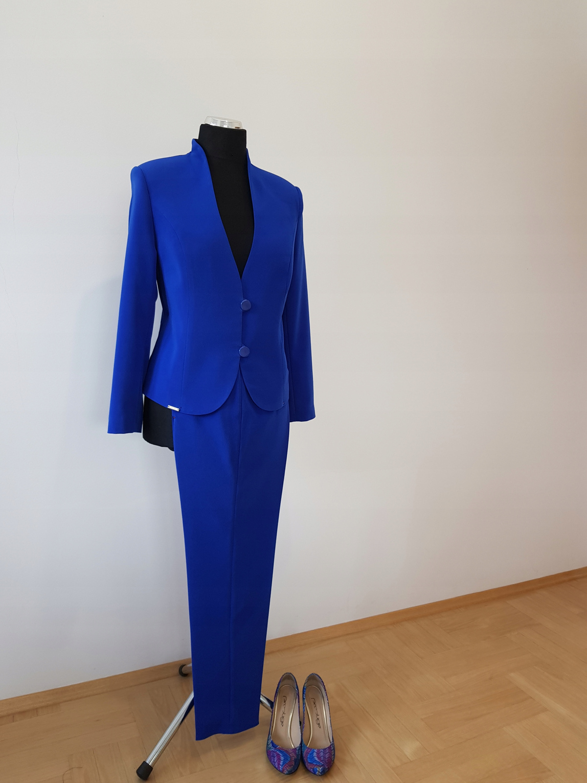 Bardzo ładny klasyczny komplet ze spodniami uszyty z kostiumowej tkaniny ,, sparking', kolor: chaber.
