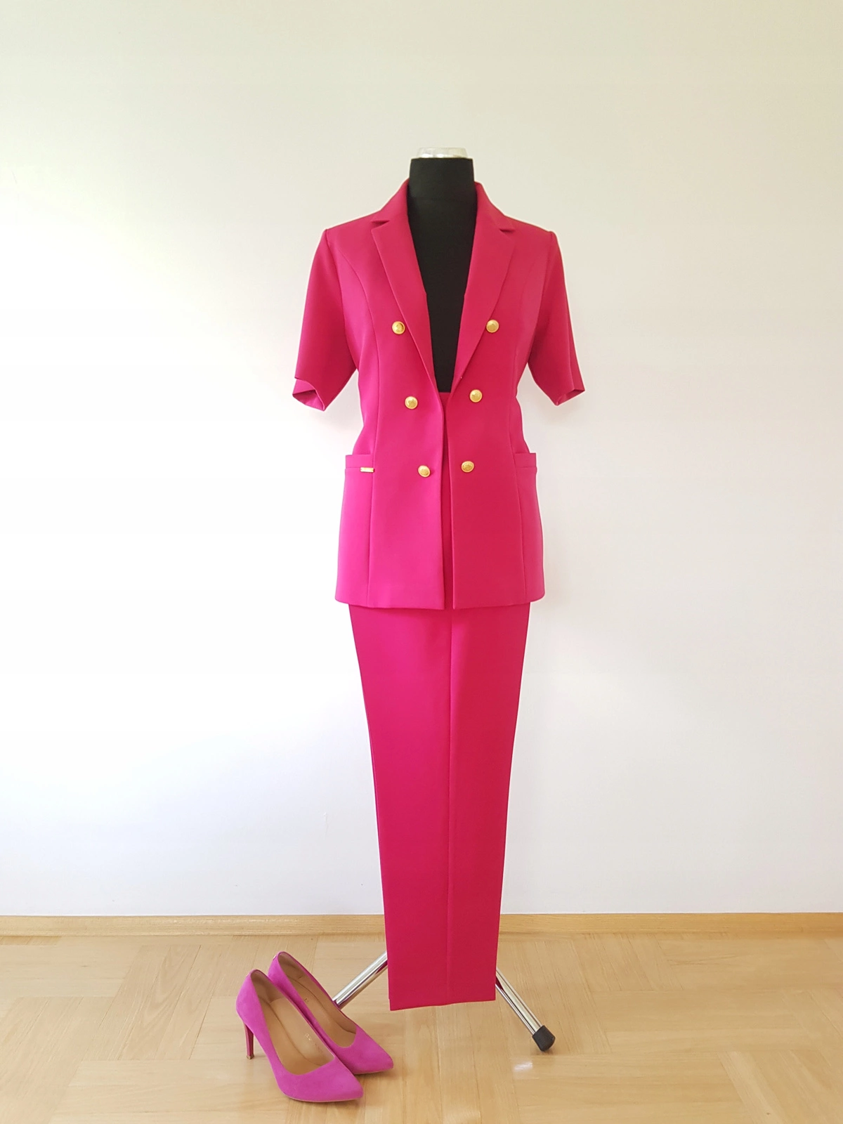 Bardzo ładny klasyczny komplet ze spodniami uszyty z kostiumowej tkaniny ,, madame', kolor: amarantowy ( fuksja).