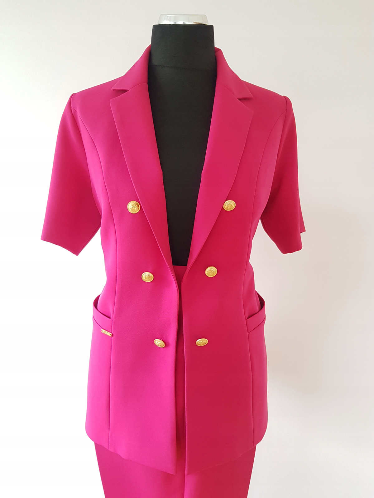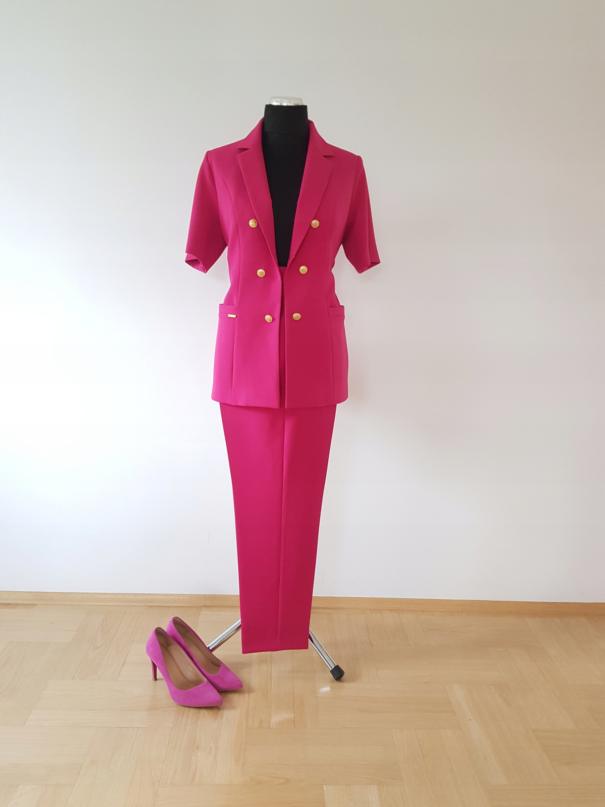 Bardzo ładny klasyczny komplet ze spodniami uszyty z kostiumowej tkaniny ,, madame', kolor: amarantowy ( fuksja).