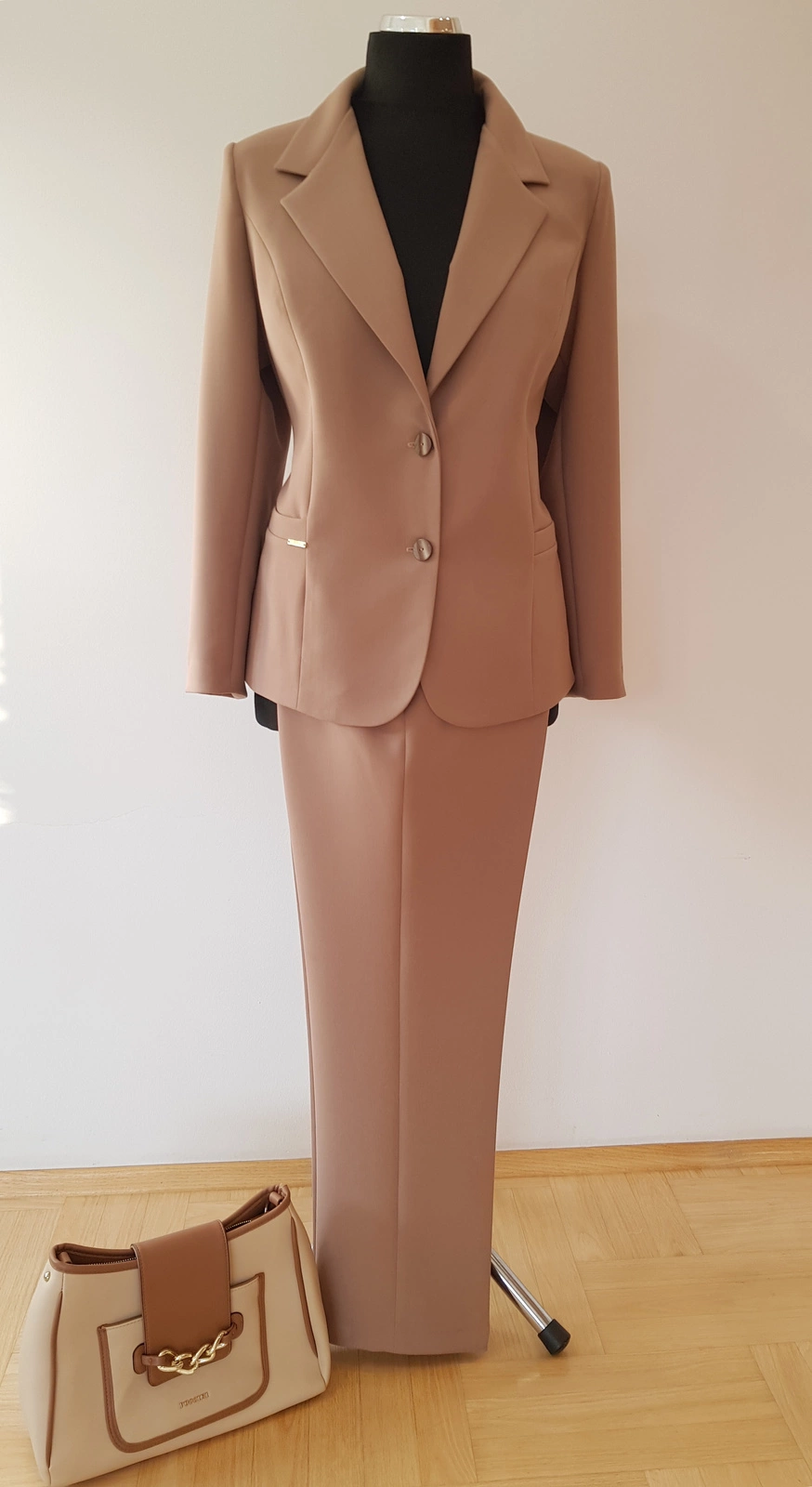 Biznesowy kostium ze spodniami uszyty z kostiumowej tkaniny ,, Jaguar ,, w kolorze beż - -cappuccino.