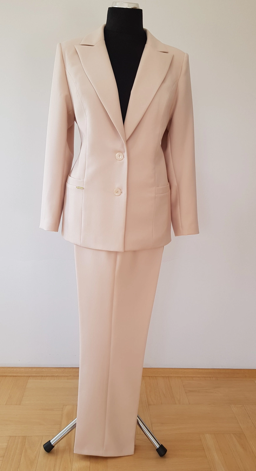 Biznesowy kostium ze spodniami uszyty z kostiumowej tkaniny ,, Jaguar ,, w kolorze jasnego ,,ciepłego" beżu.