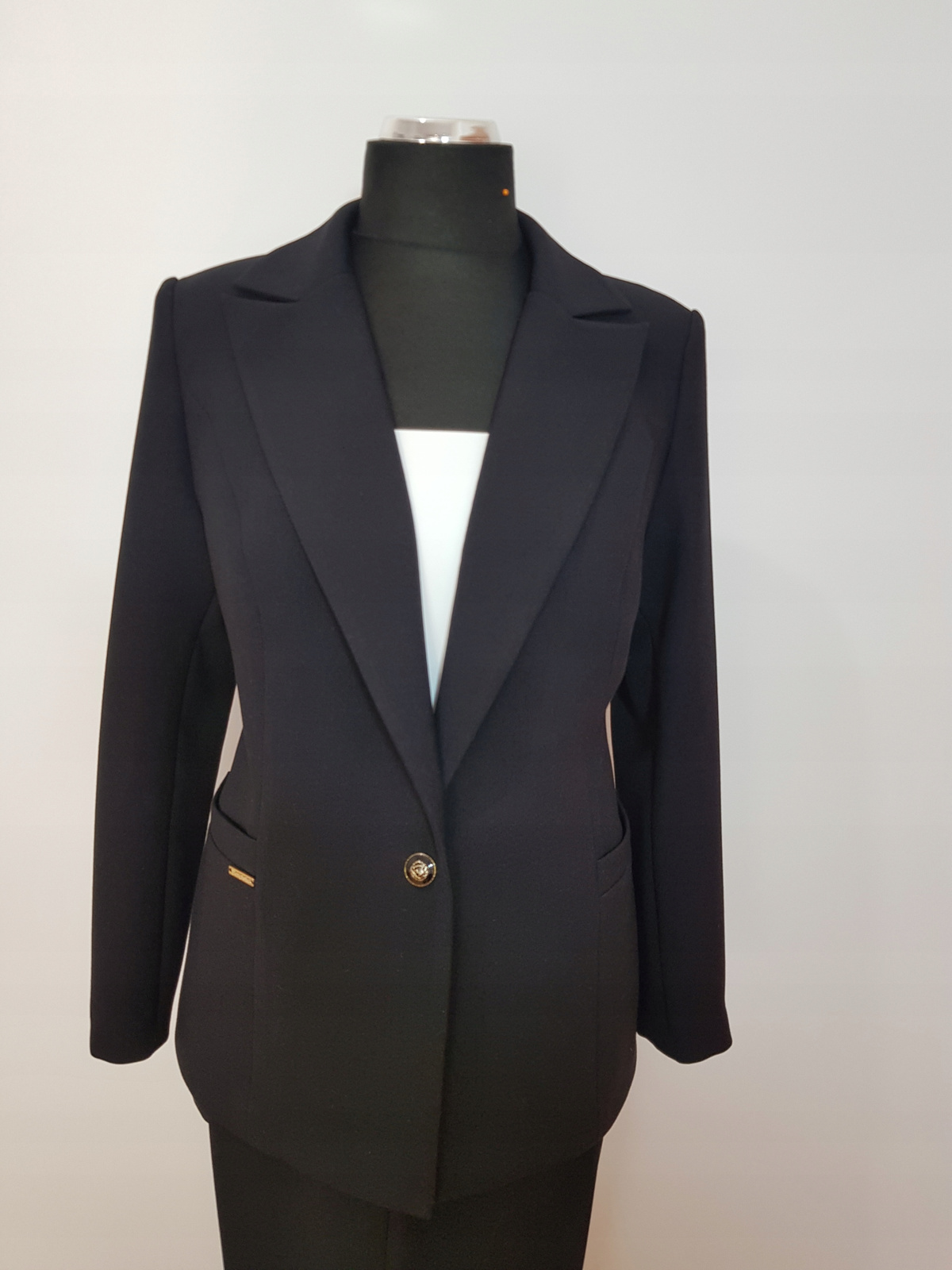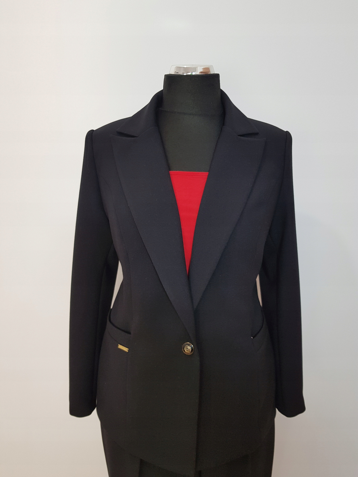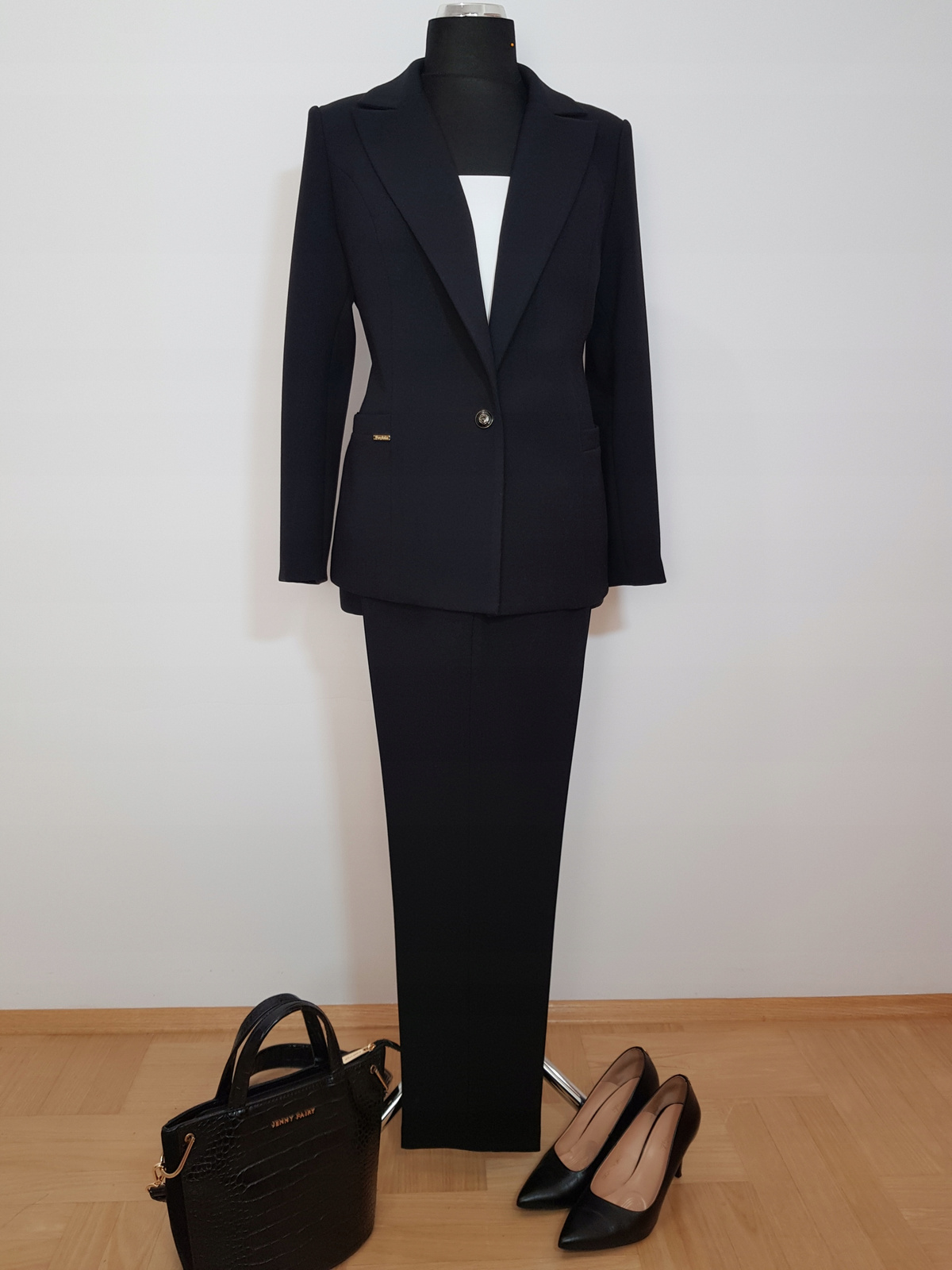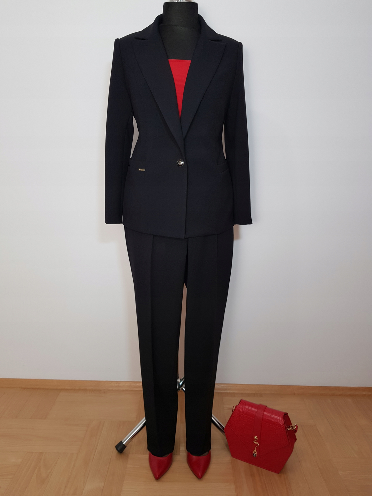 Biznesowy kostium ze spodniami uszyty z kostiumowej tkaniny ,, Jaguar ,, w kolorze czarnym.