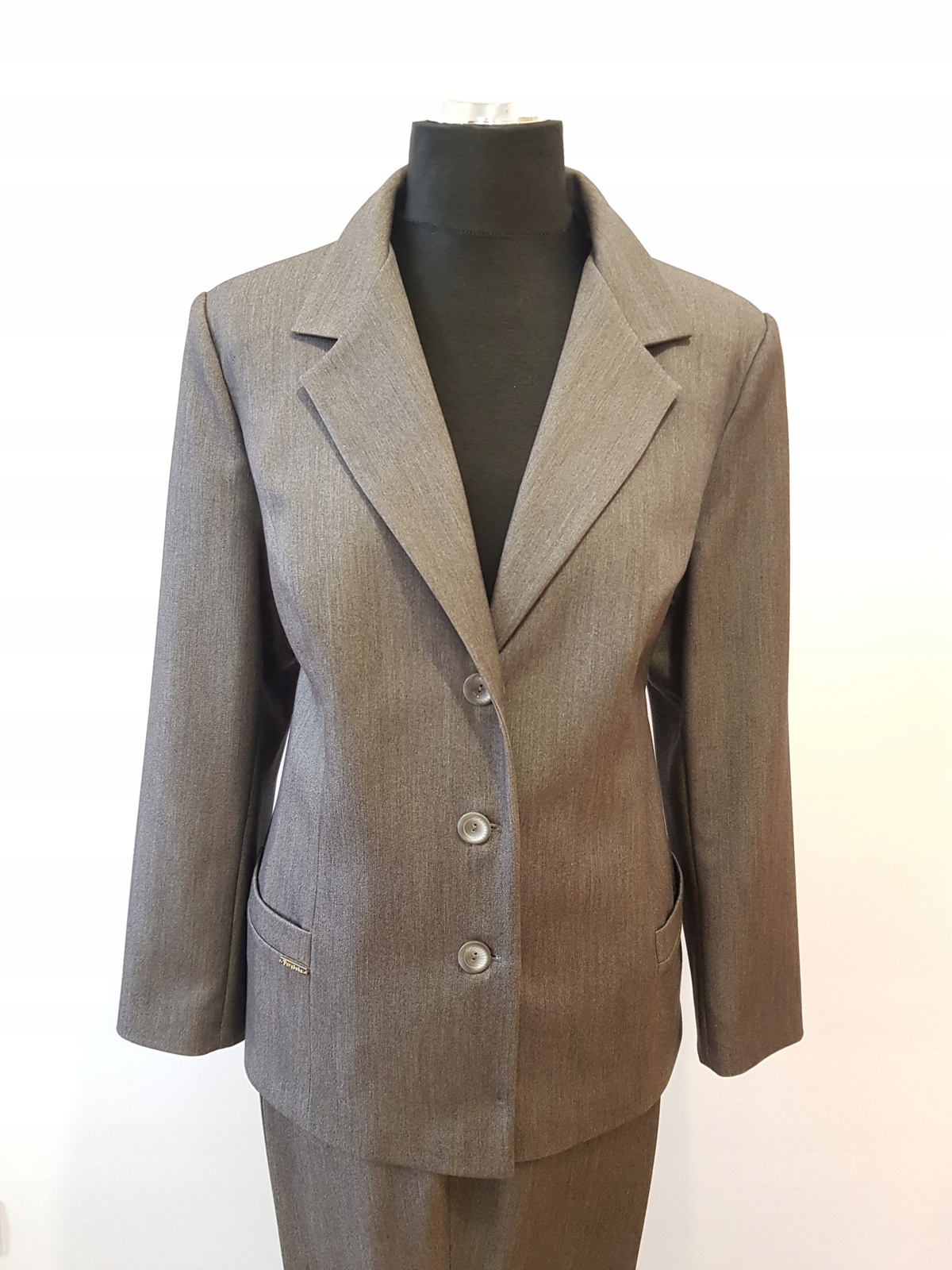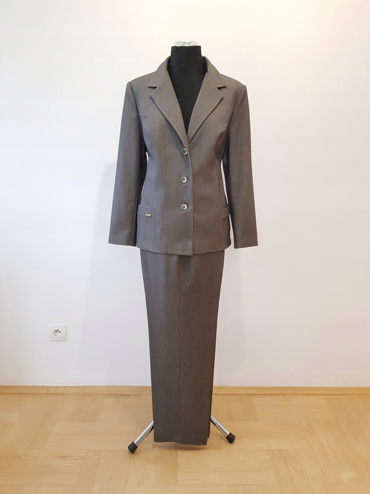 Bardzo ładny klasyczny kostium uszyty z kostiumowej tkaniny w kolorze popielatym.