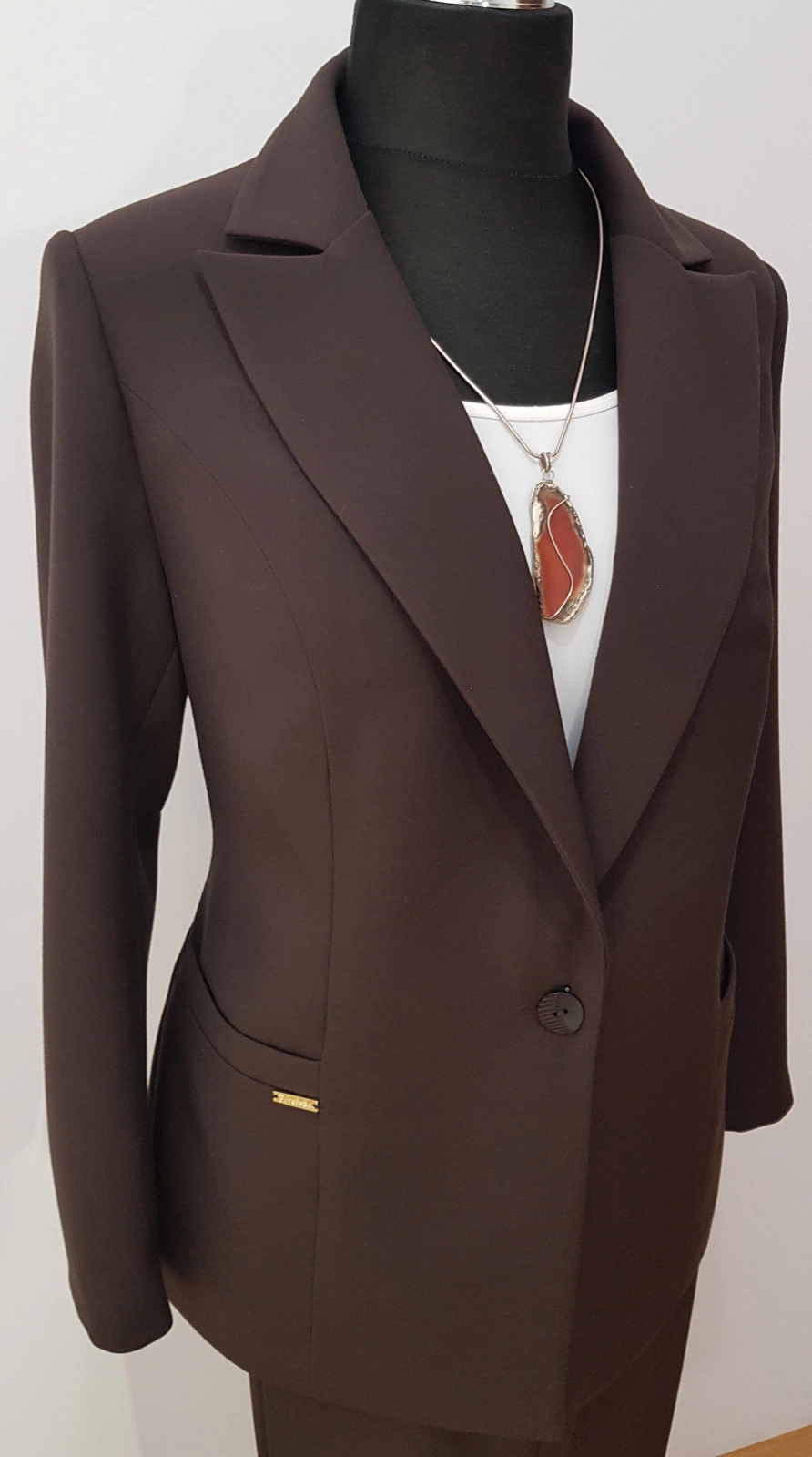 Bardzo ładny biznesowy żakiet uszyty z tkaniny kostiumowej ,, Jaguar " w kolorze brązowym.