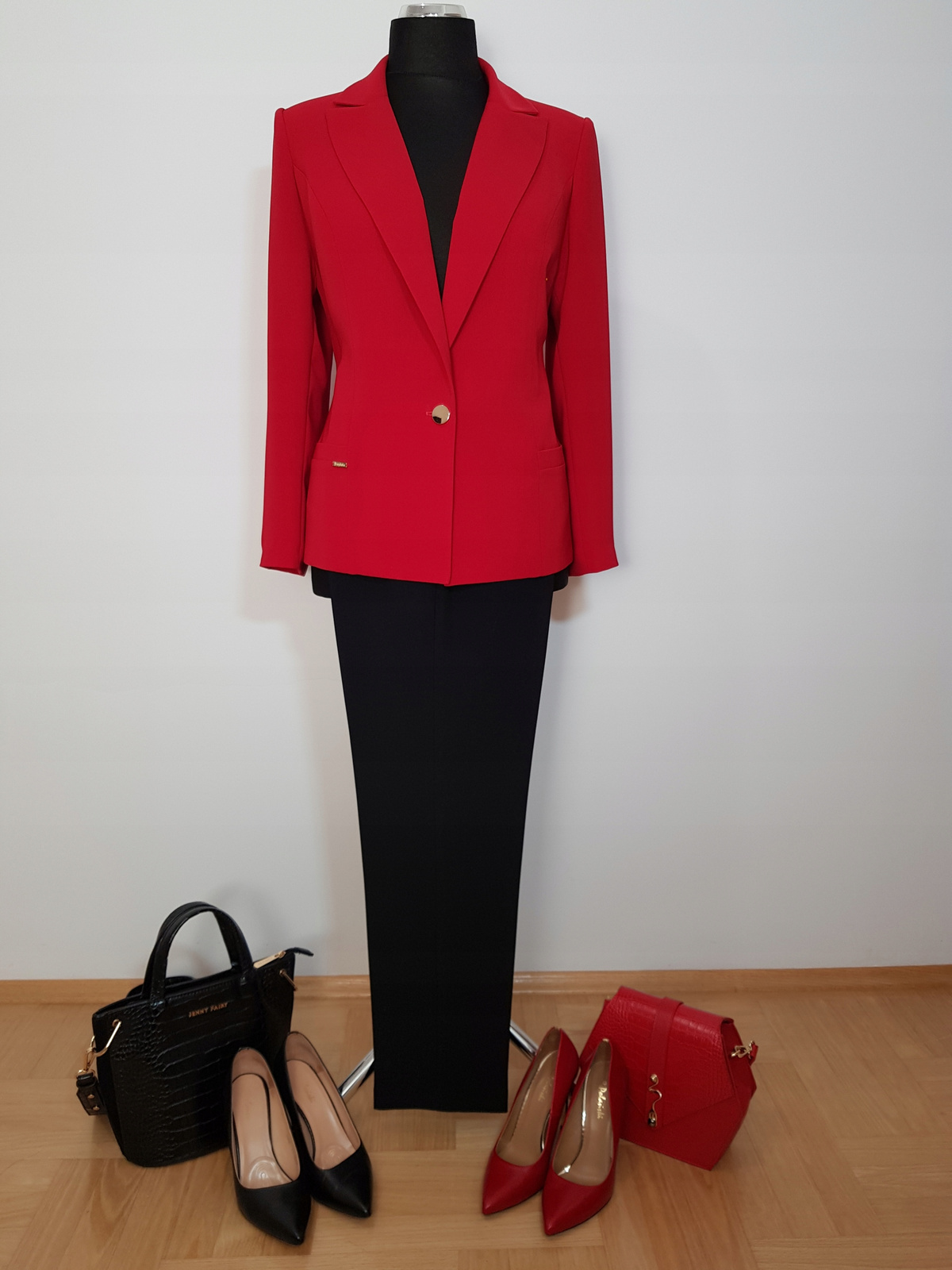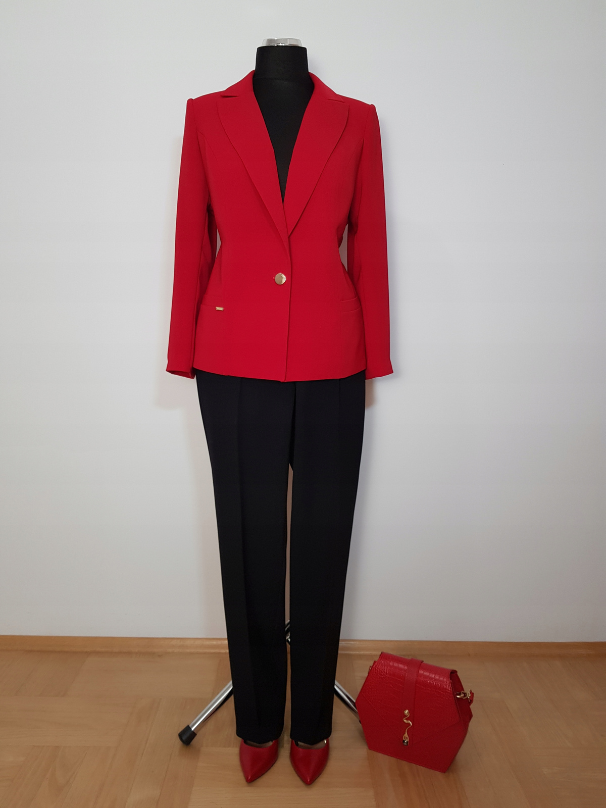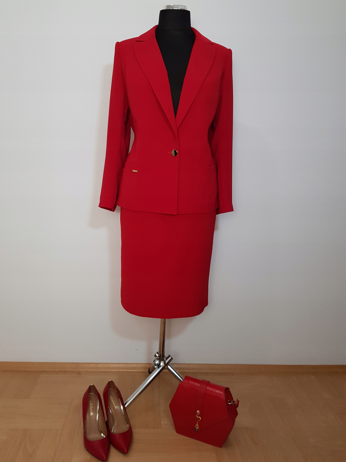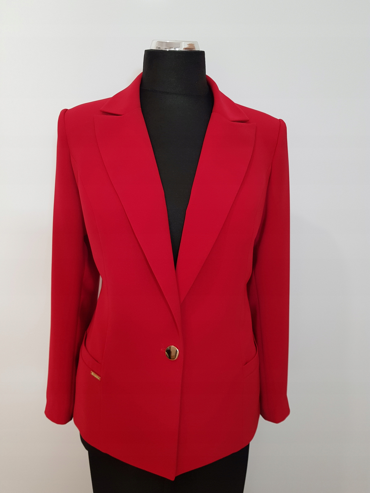 Bardzo ładny klasyczny żakiet uszyty z tkaniny merino w kolorze czerwonym.