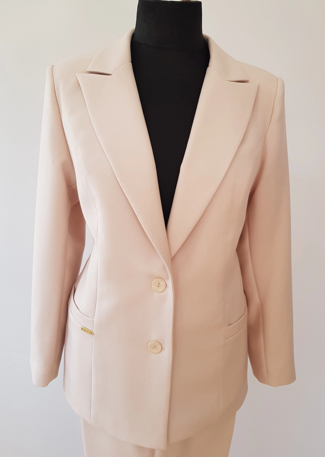Bardzo ładny biznesowy żakiet uszyty z tkaniny kostiumowej ,, Jaguar " w kolorze jasnego ,,ciepłego" beżu .