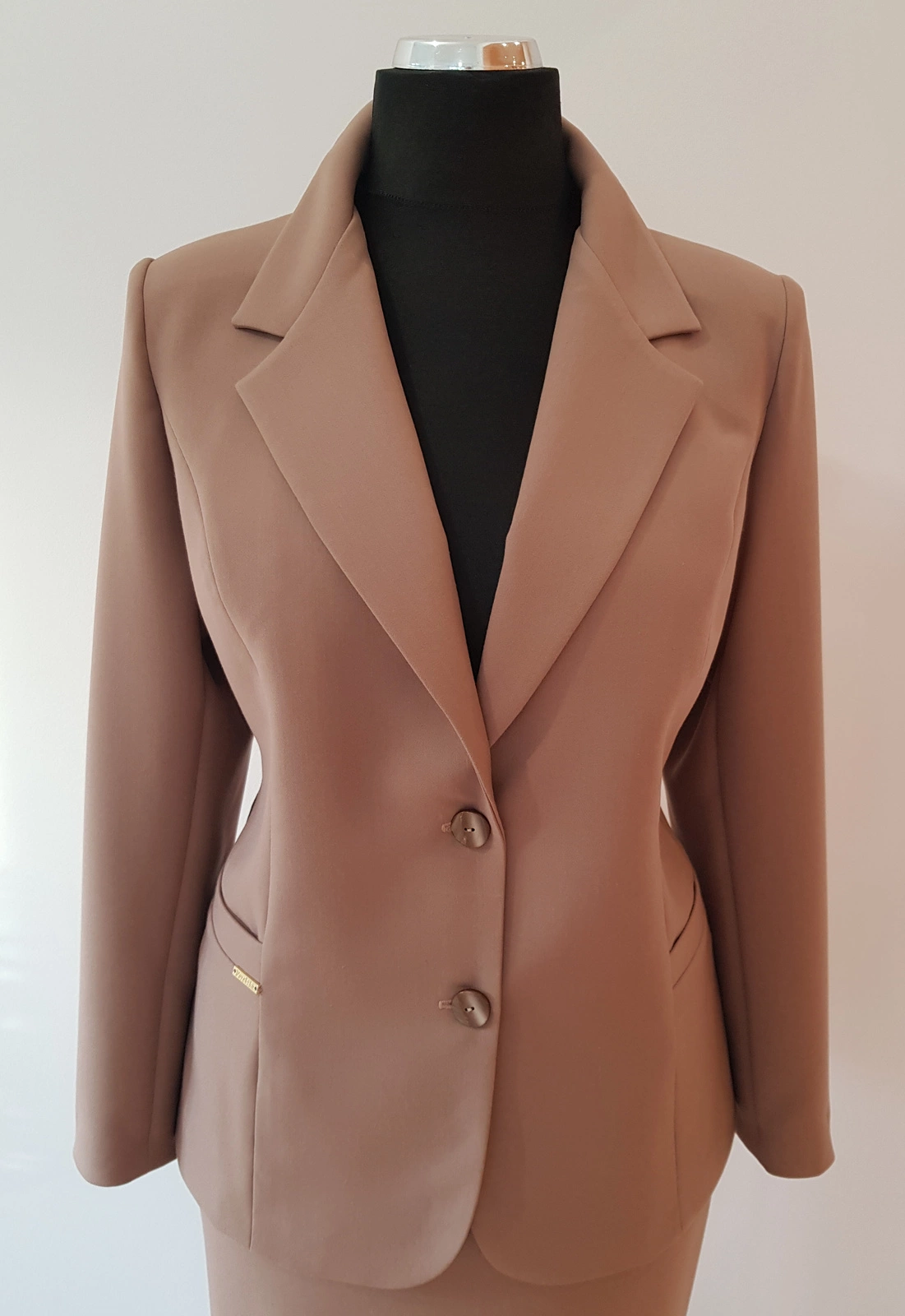 Bardzo ładny biznesowy żakiet uszyty z tkaniny kostiumowej ,, Jaguar " w kolorze beż - cappucciono.