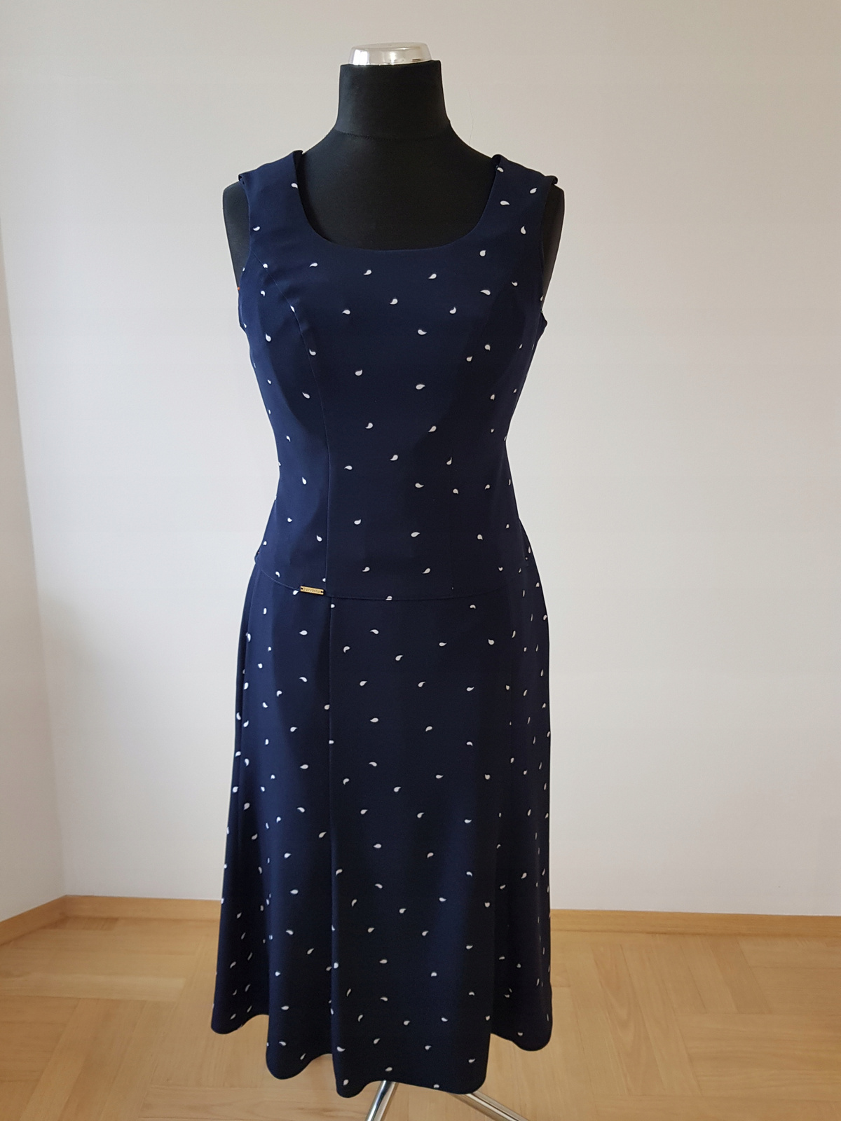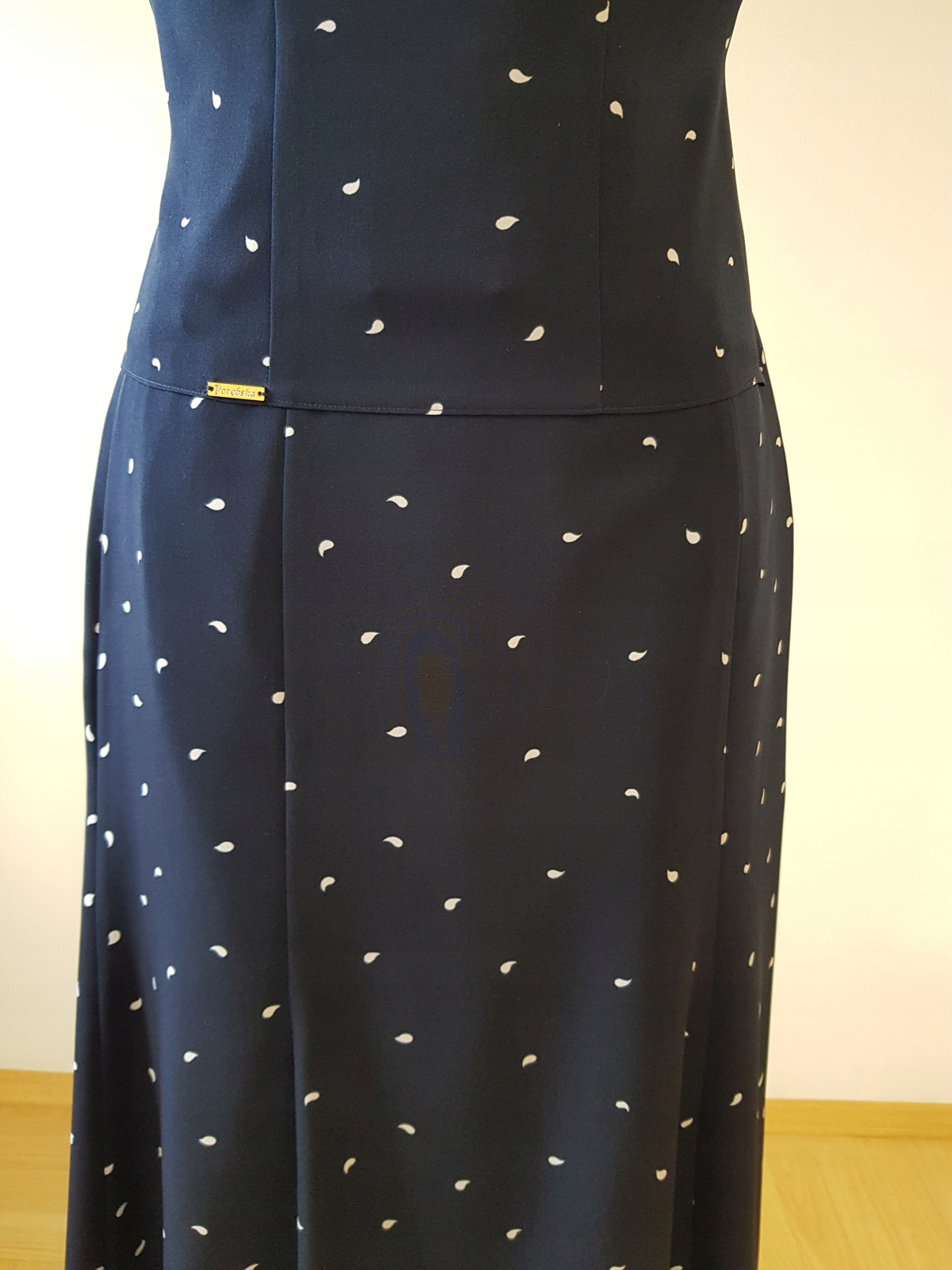 Garsonka uszyta z lejącej zwiewnej tkaniny poliwiskoza. Granatowa z białym wzorkiem