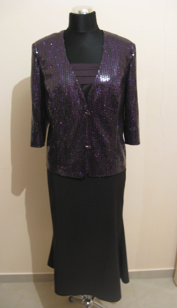 Top i spódniczka uszyta jest z satyny z laykrą o delikatnym połysku kolor śliwkowy mieniący się w czarny.
