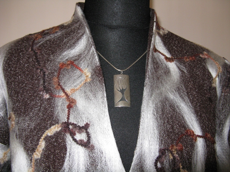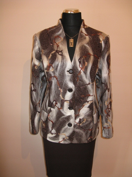 Bardzo oryginalny żakiet uszyty z grubszej kostiumowej tkaniny brązowej , wyszywany cieniowaną włóczką.