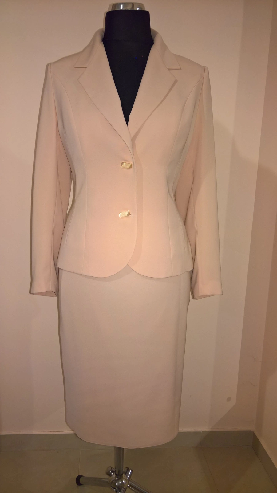 Klasyczny kostium uszyty z tkaniny merino w kolorze beżowym.