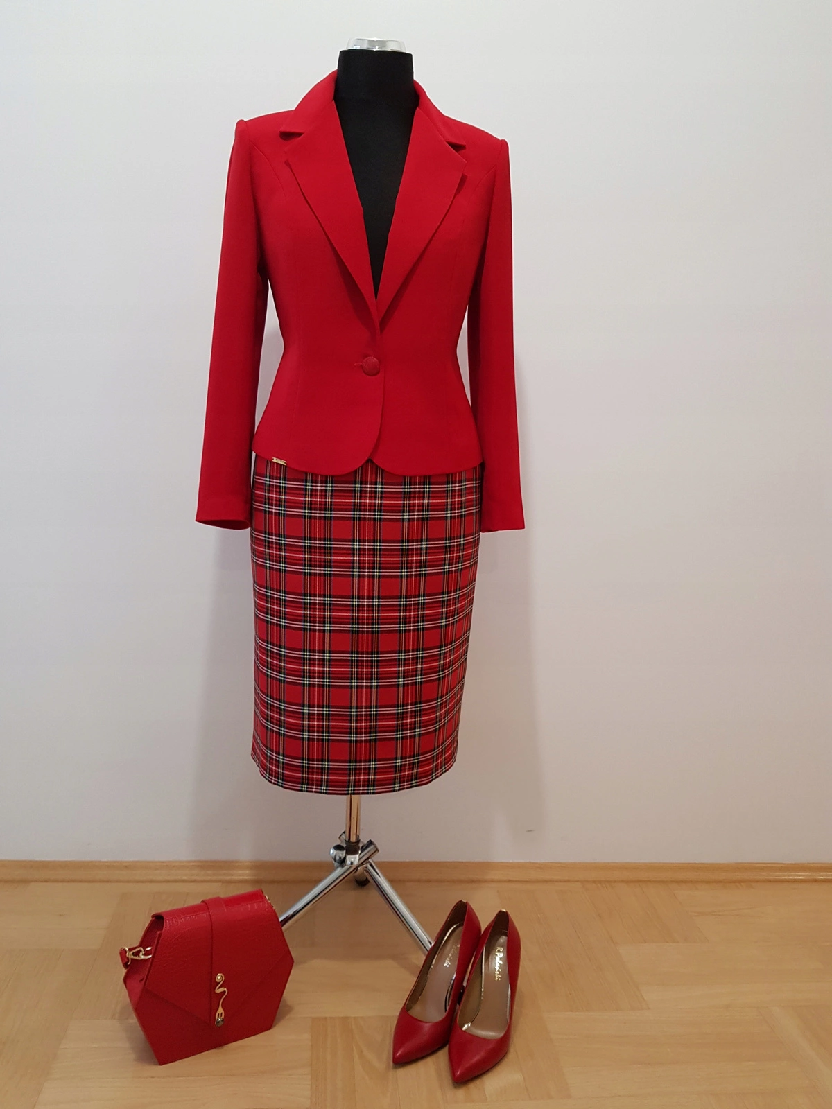 Żakiet uszyty jest z tkaniny merino w kolorze czerwonym, natomiast spódniczka z tkaniny kostiumowej w kratkę.