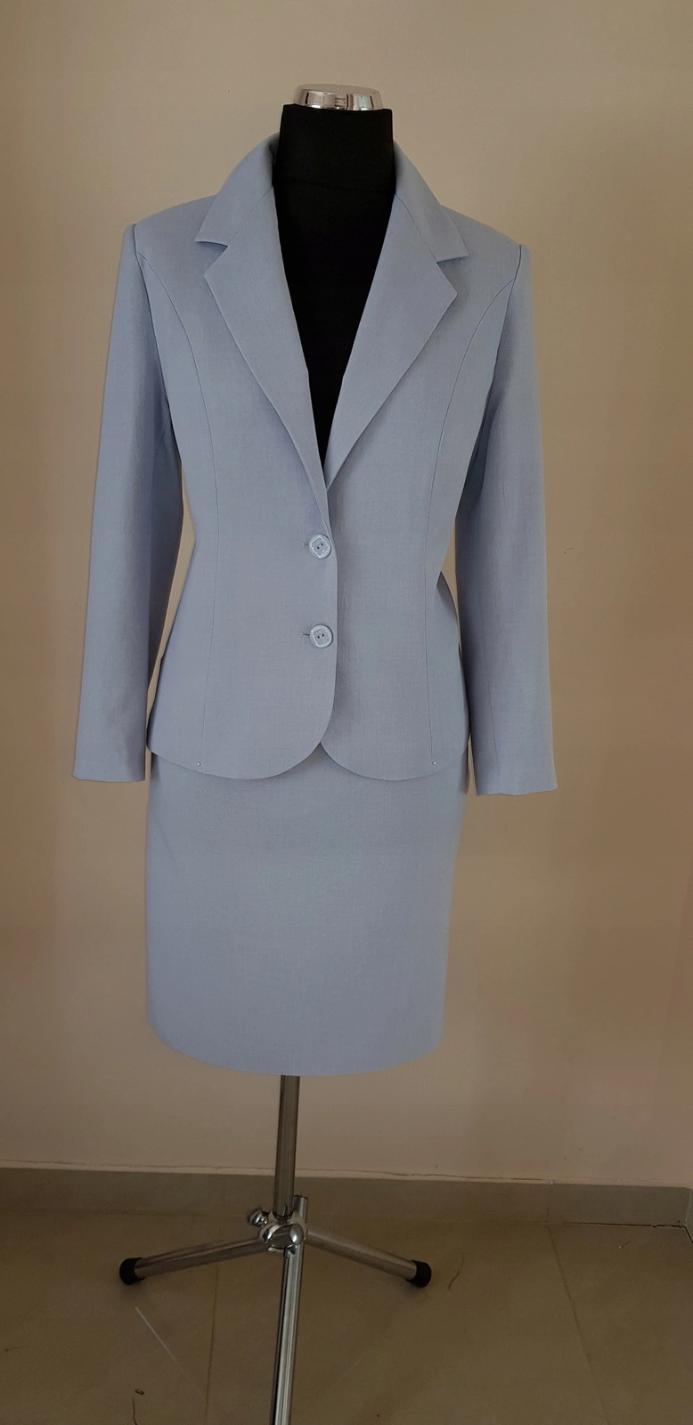 Klasyczny kostium uszyty z tkaniny kostiumowej ,, alalen'' w kolorze gołąbkowym ( jasny błękit wpadający w popiel).