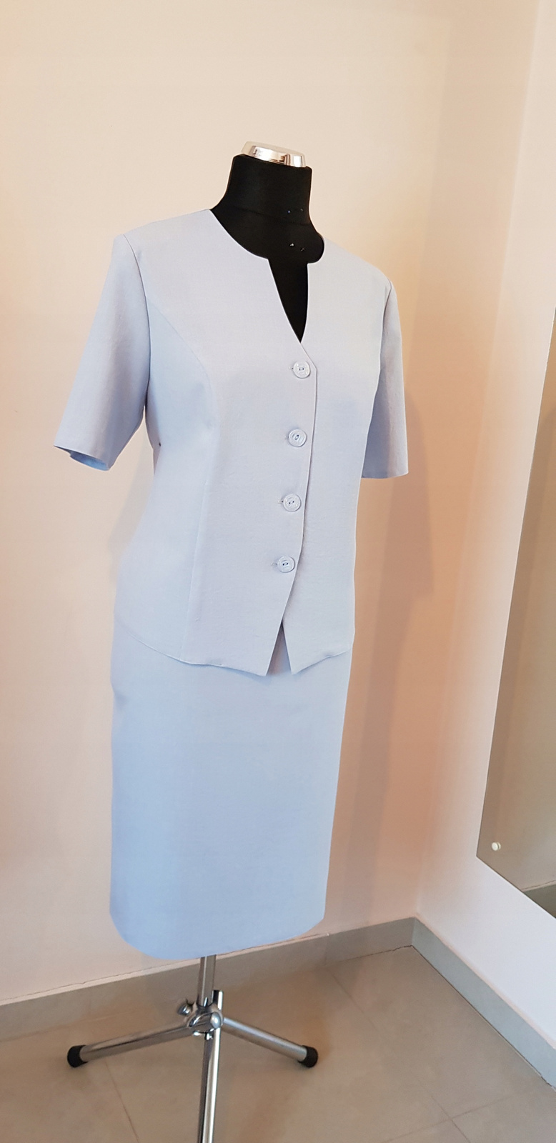 Bardzo ładny klasyczny kostium uszyty z tkaniny kostiumowej ,, alalen'' w kolorze gołąbkowym ( jasny błękit wpadający w popiel).