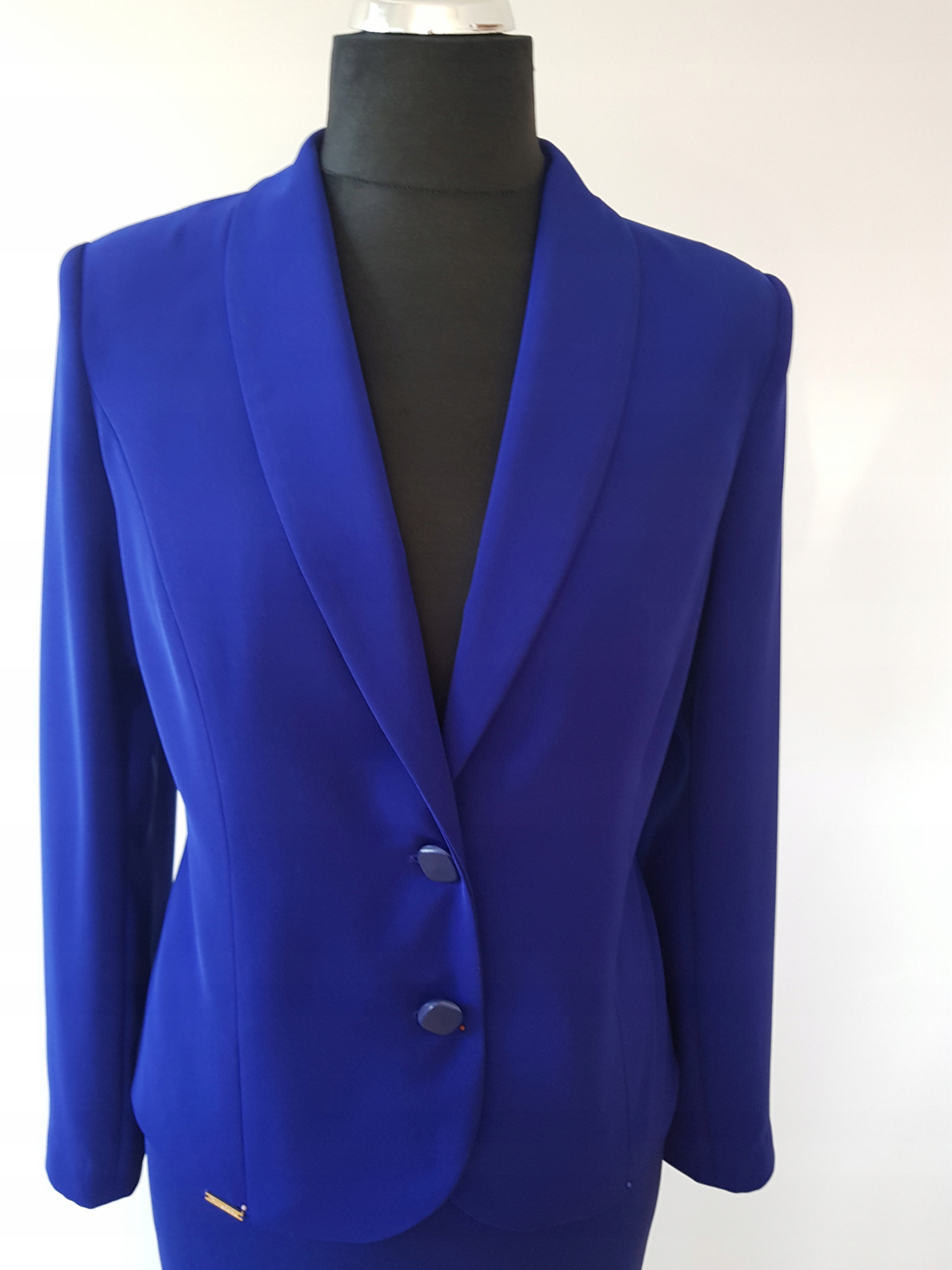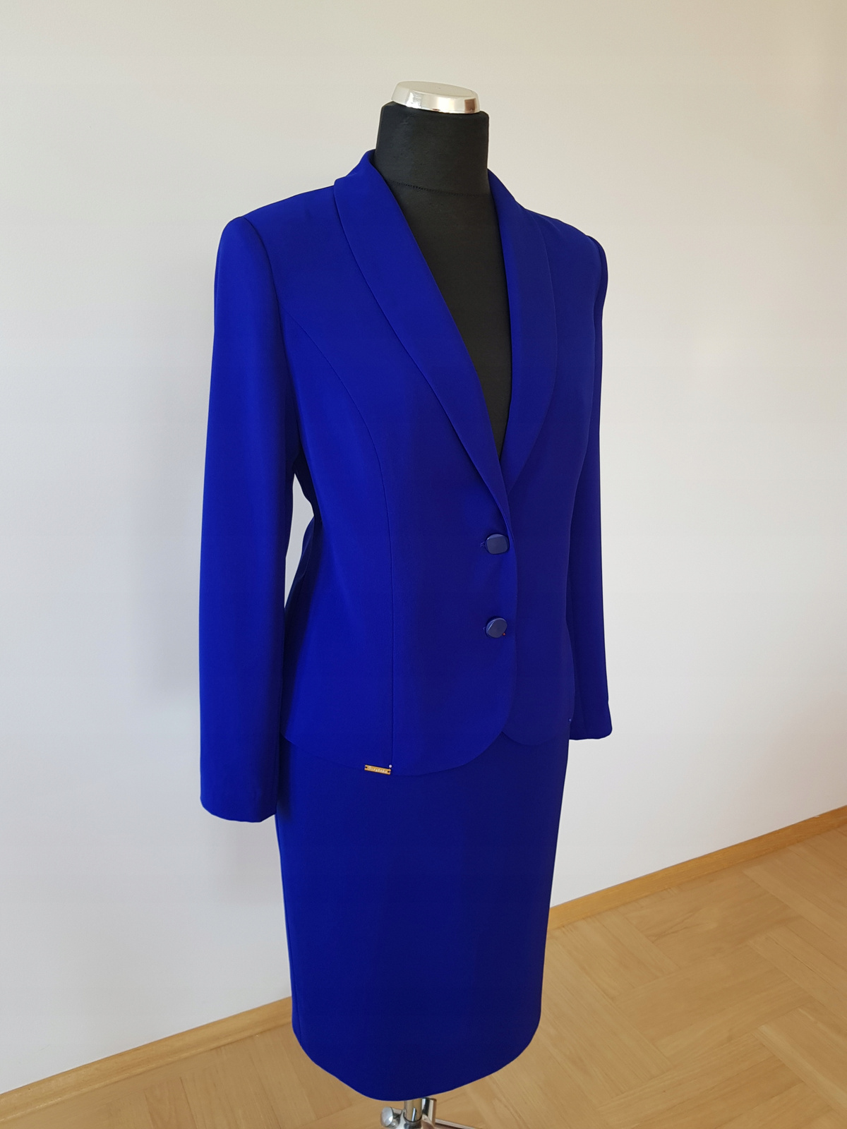 Bardzo ładny kostium uszyty z tkaniny merino w kolorze chaber z szalowym kołnierzem.