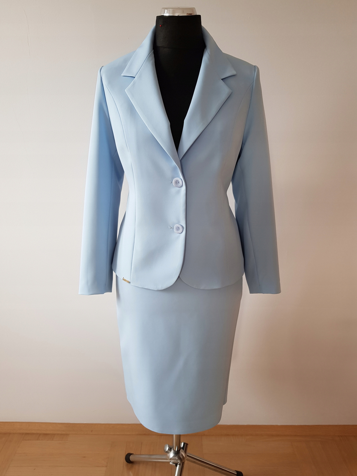 Bardzo ładny klasyczny kostium biznesowy uszyty z tkaniny ,,madame '' w kolorze niebieskim.