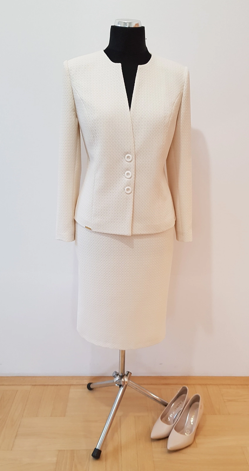 Kostium jest uszyty z tkaniny kostiumowej ze splotem delikatnej krateczki.