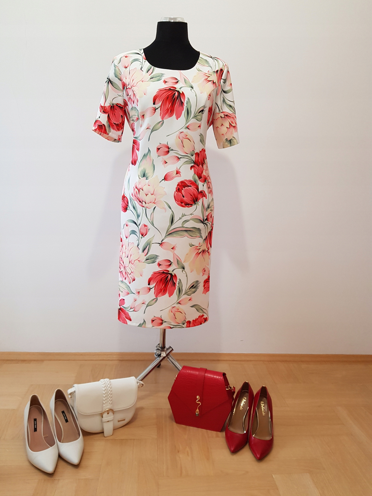 Sukienka jest wąska, lekko zwężona do dołu ,, ołówkowa" Cięcia francuskie.