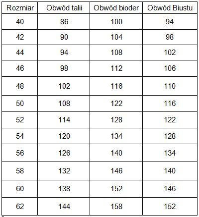 Dopasowując rozmiar do sylwetki należy dodać do obwodu bioder min. 2 cm ,a do obwodu biustu 4 cm