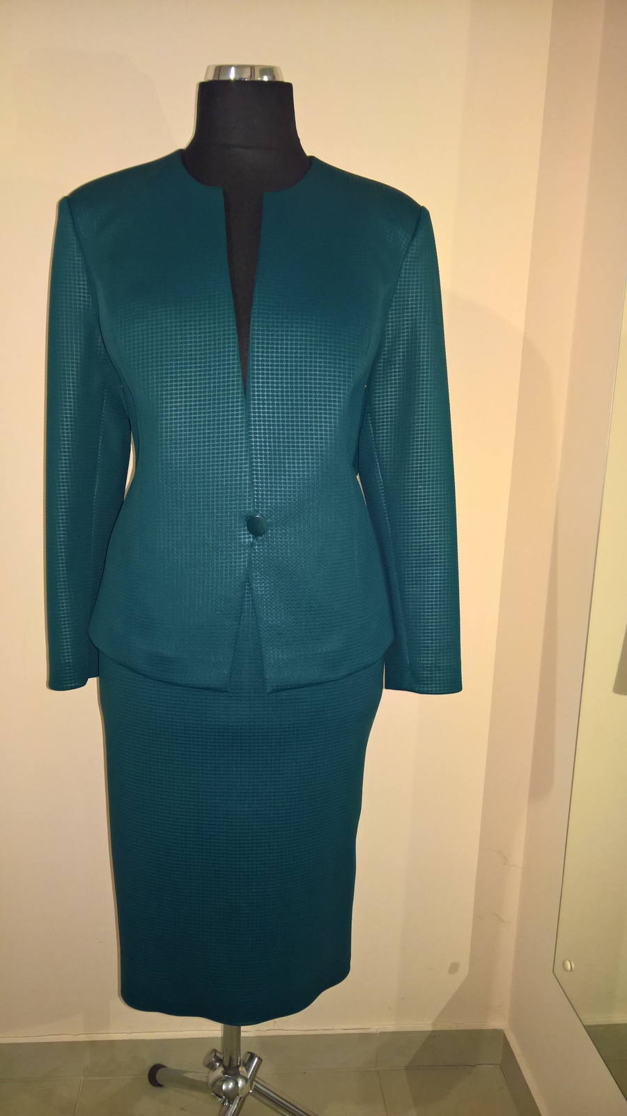 Klasyczny kostium uszyty z dzianiny z delikatnie tłoczonym wzorem kosteczki w kolorze zielonym, rozmiar 50.