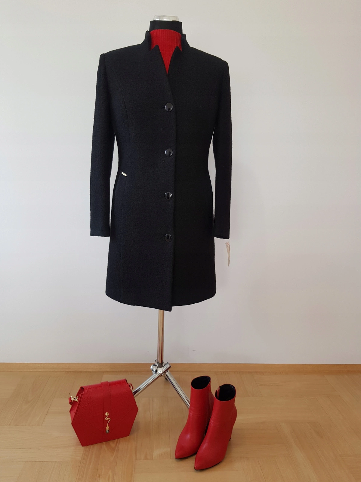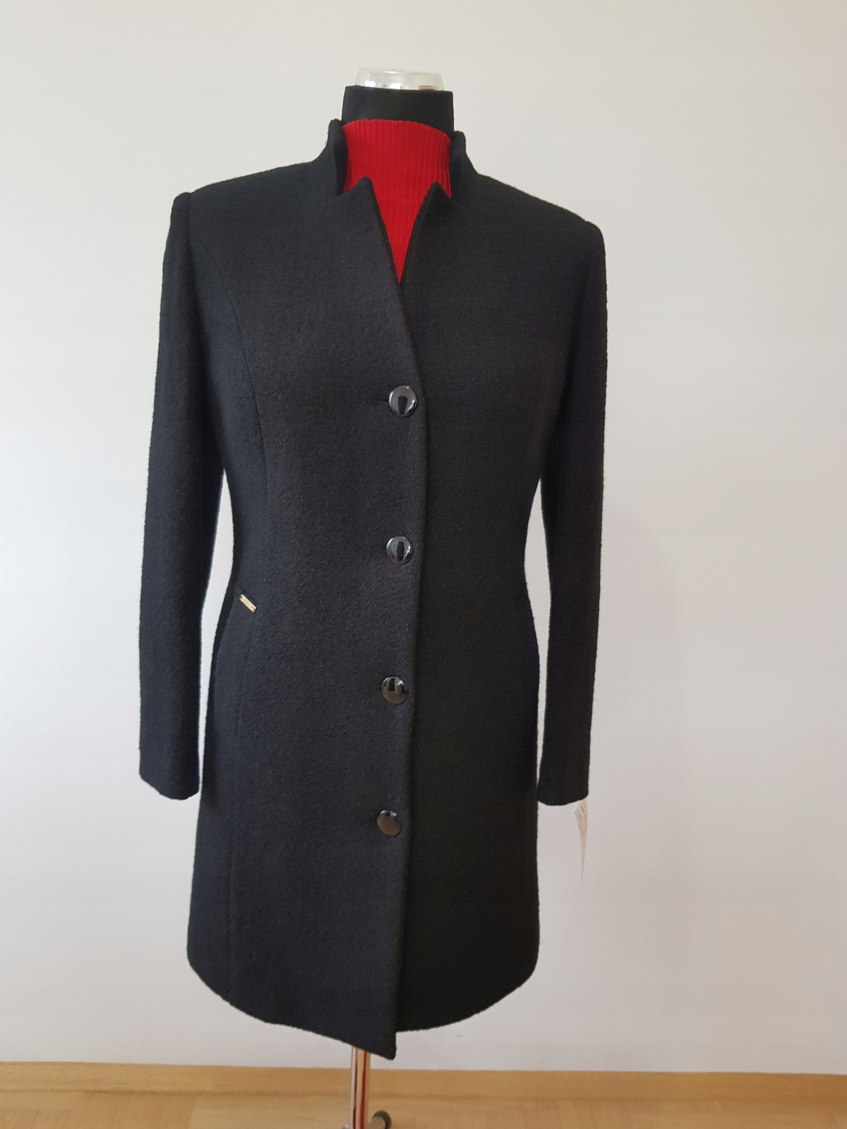 Bardzo ładny płaszczyk uszyty z wełnianej tkaniny (splot mini bukli) w kolorze czarnym ( możliwość zamówienia w kolorze bordowym camel oraz granatowym)