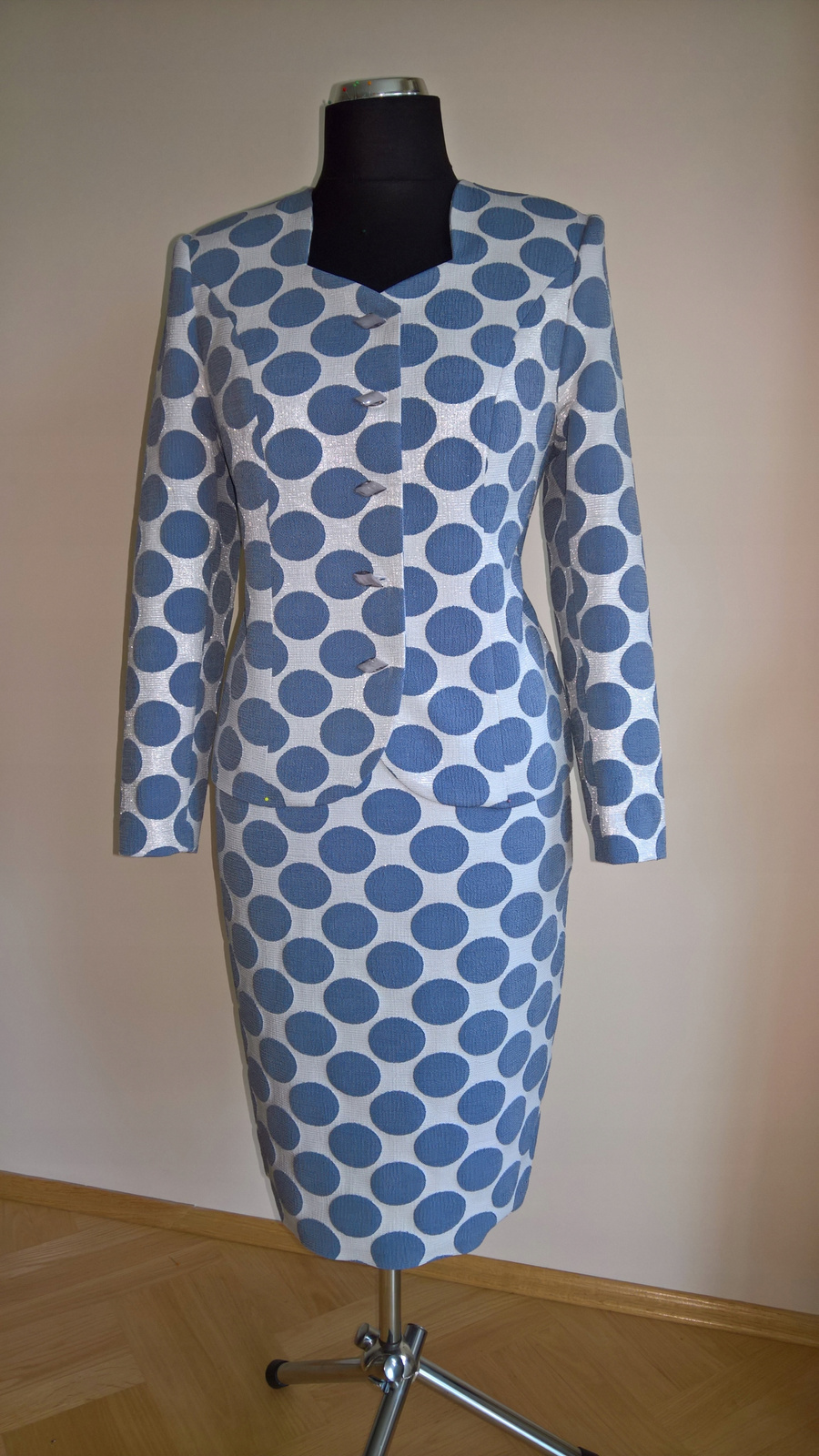Uszyty z żakardowej tkaniny w grochy ( tkanina z dodatkiem laykry) .