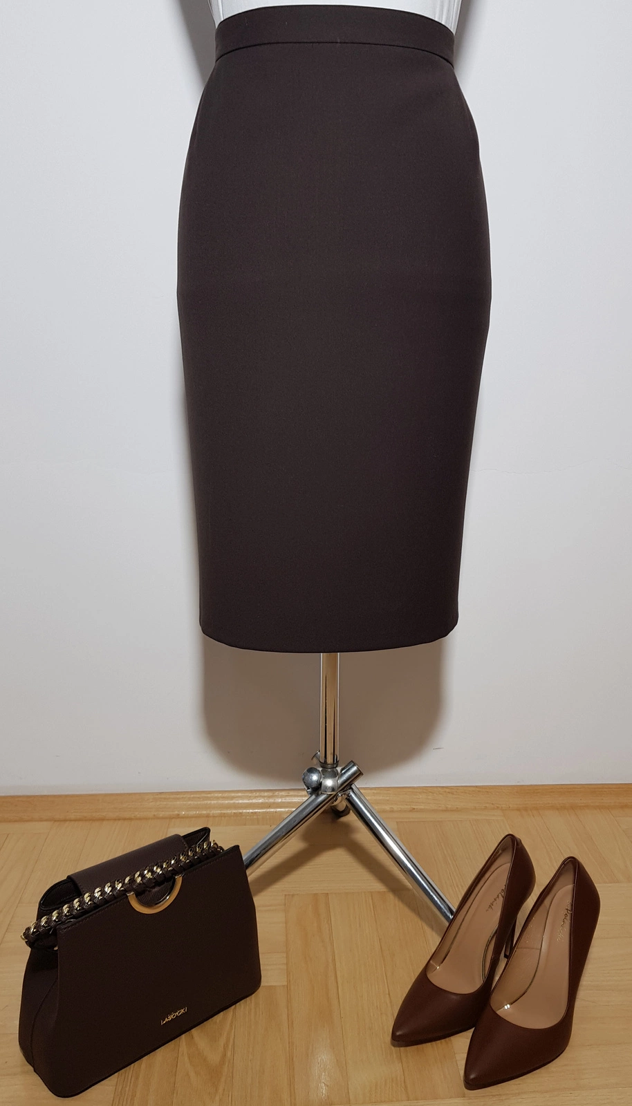 Spódniczka jest,, ołówkowa" wąska , delikatnie zwężona do dołu z założonym rozcięciem z tyłu.