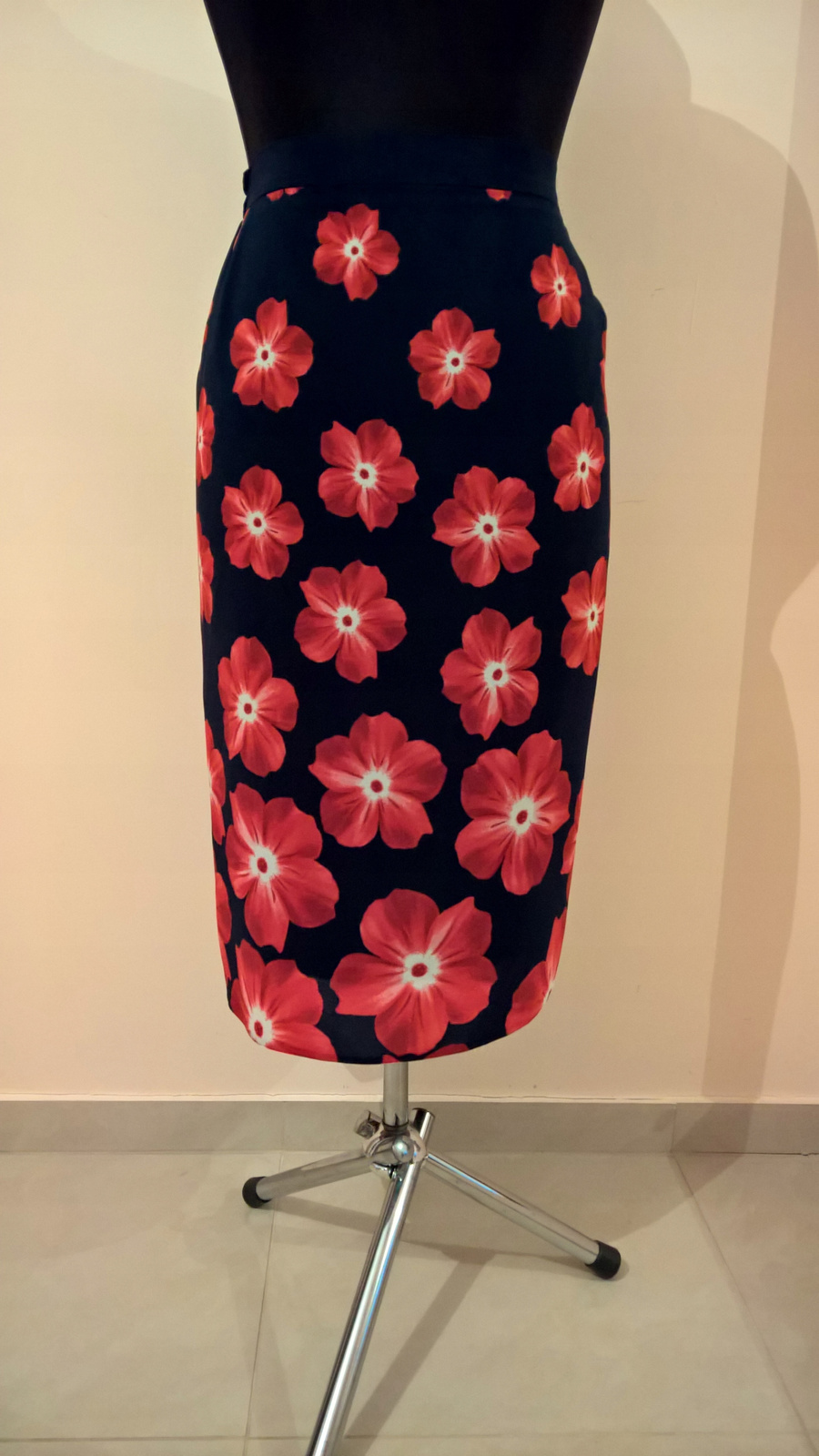 Spódnica uszyta jest z ładnej lejącej tkaniny ,,poliwiskoza". Kolor: granatowy w kwiaty.