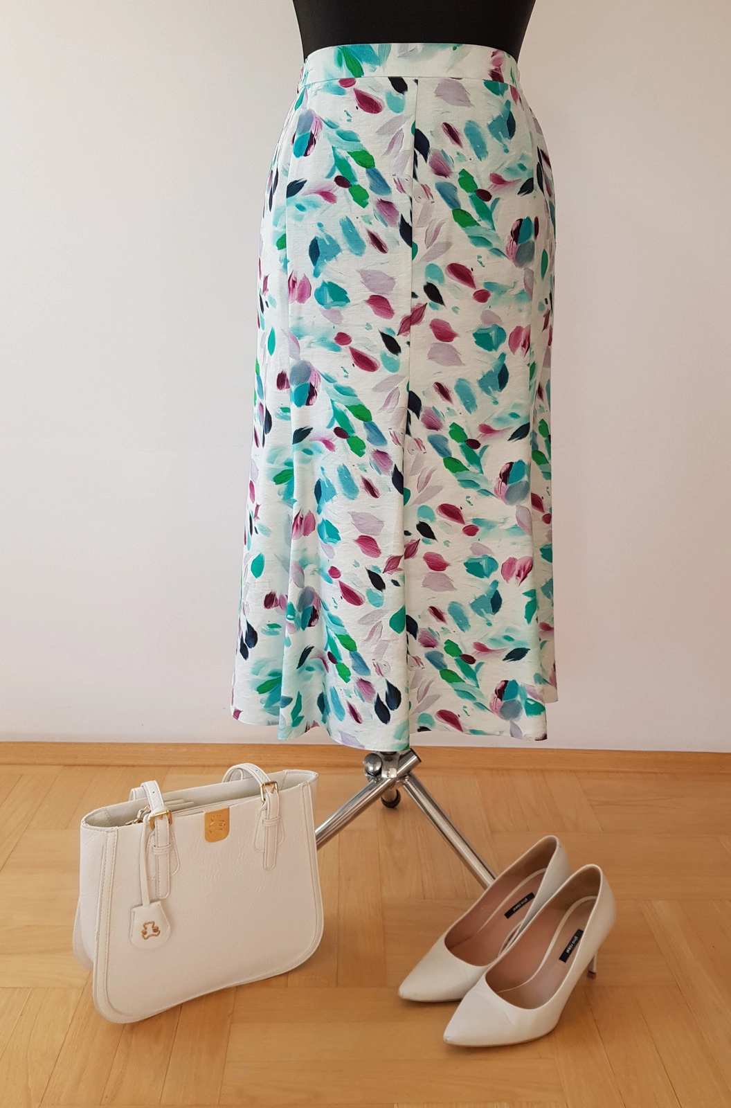 Fason spódniczki ,,tulipan", uszyta z 8 klinów. Wąska do kolan i lekko poszerza się do dołu.