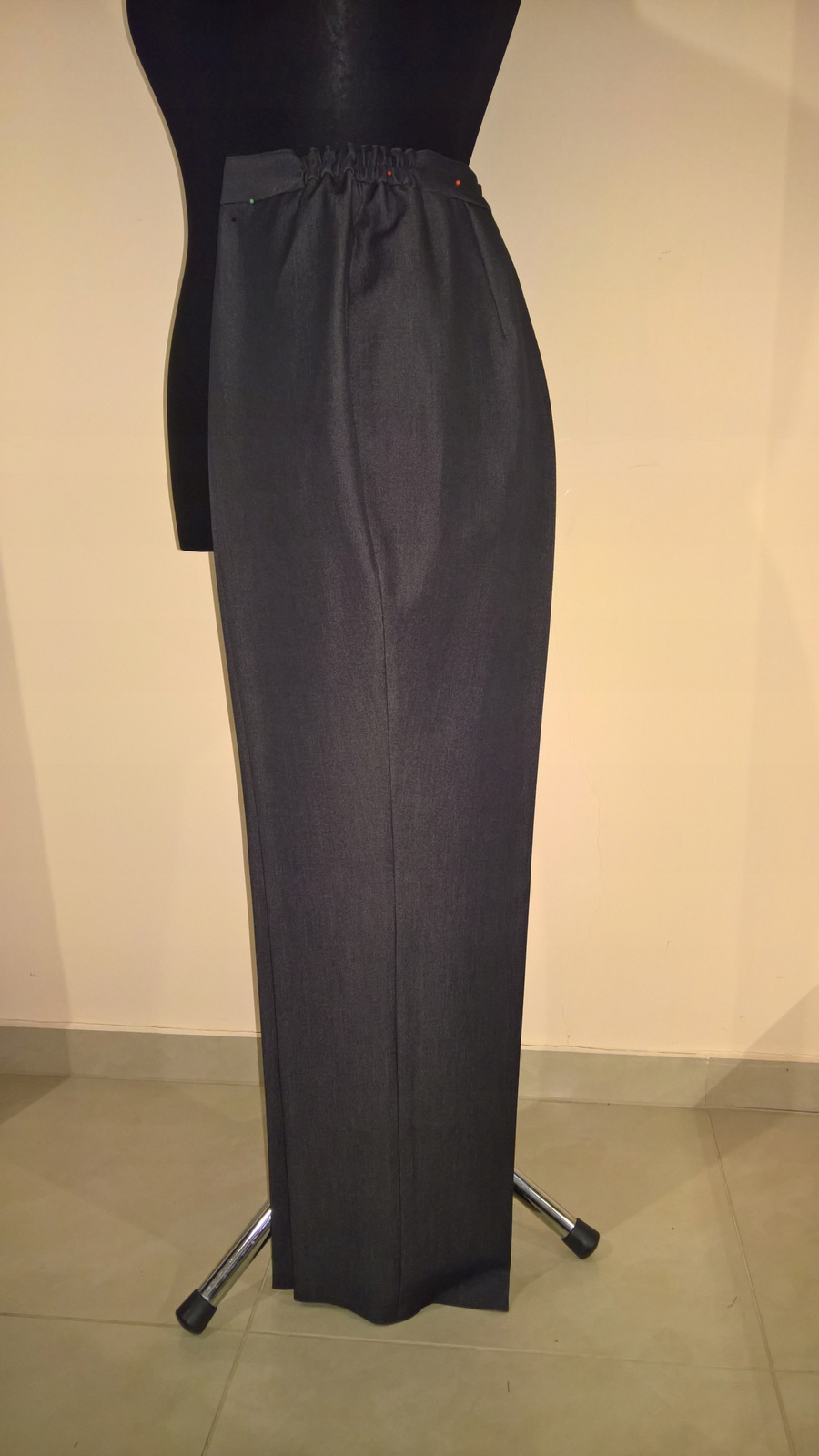 Spodnie klasyczne uszyte z kostiumowej tkaniny w kolorze grafitowym.