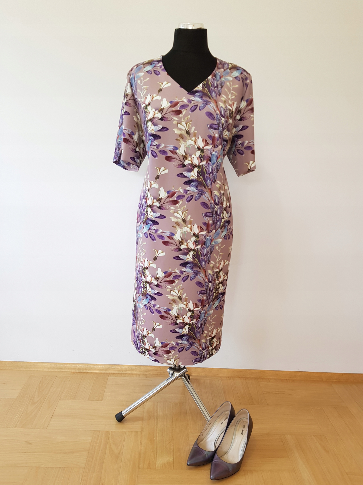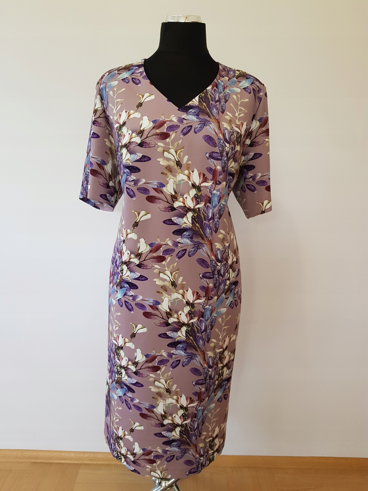 Sukienka jest wąska, lekko zwężona do dołu ,, ołówkowa" Cięcia francuskie.