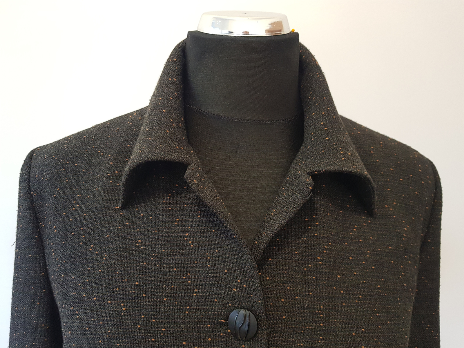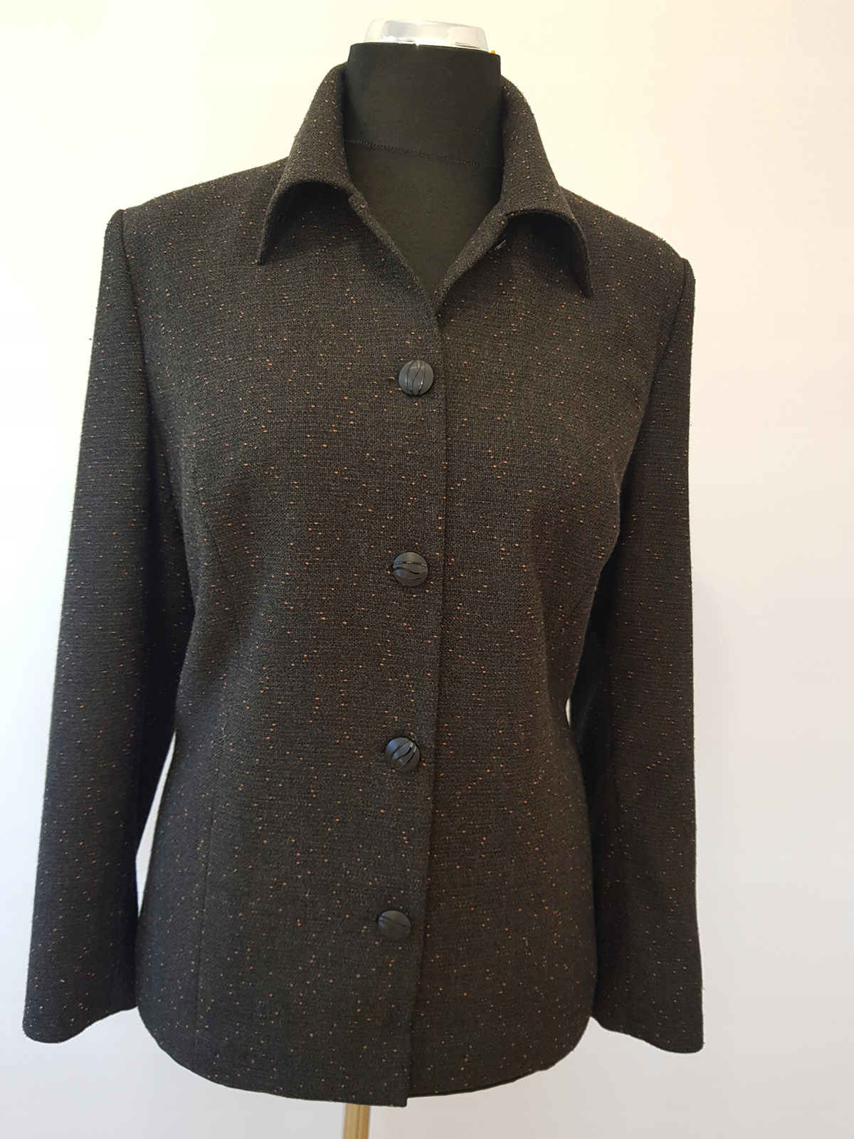 Bardzo ładny żakiet uszyty z tkaniny kostiumowej w kolorze grafitowym wpadającym w ciemną zieleń. Z pomarańczowymi punkcikami.